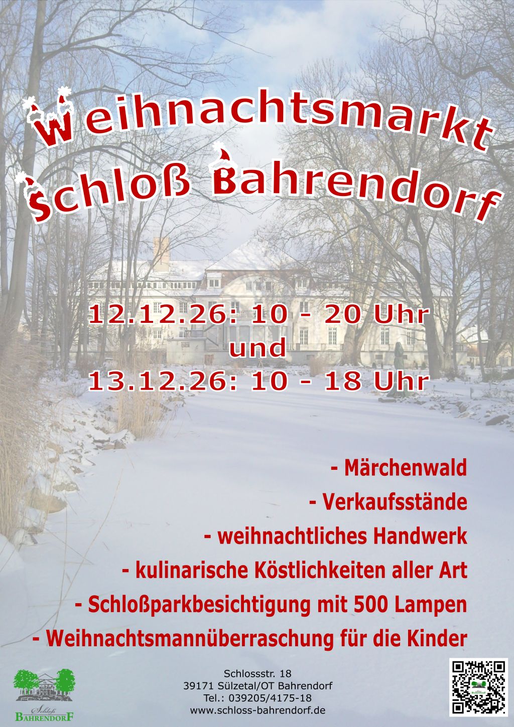 Auch in diesem Jahr wird es wieder einen Weihnachtsmarkt auf Schloss Bahrendorf geben. Am 3. Adventwochenende werden wir wieder das Areal weihnachtlich schmücken und alle Besucher Herzlich Willkommen heißen.